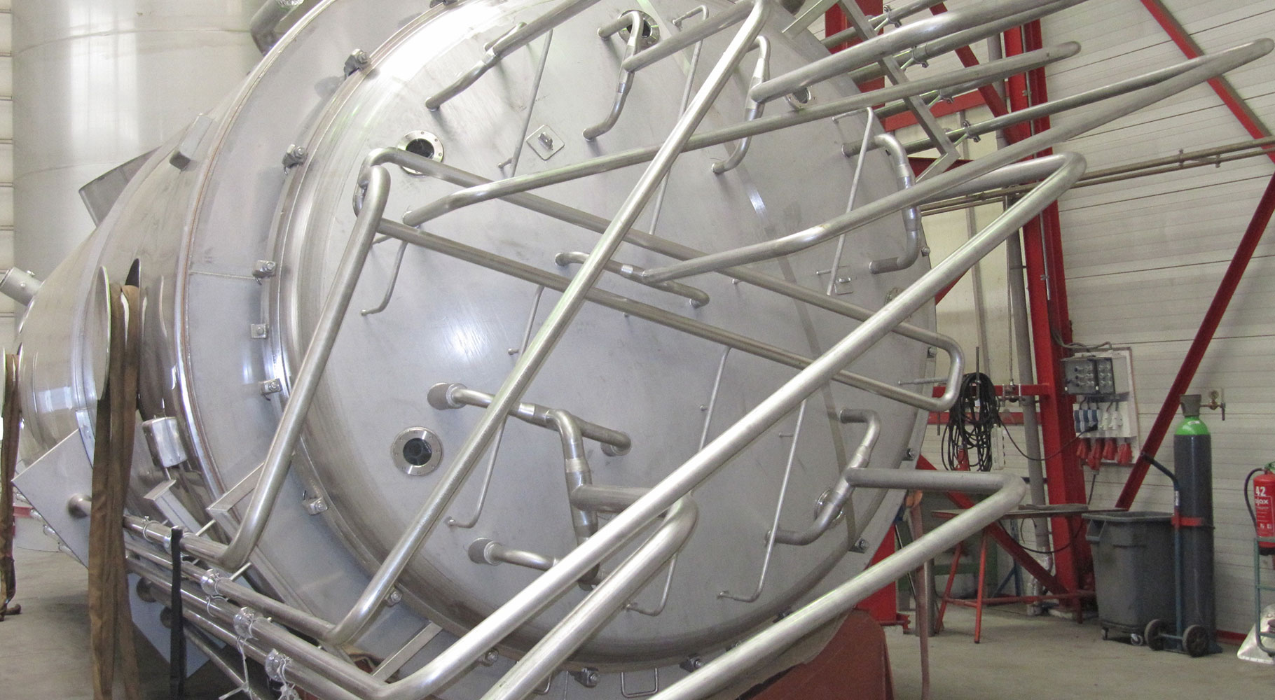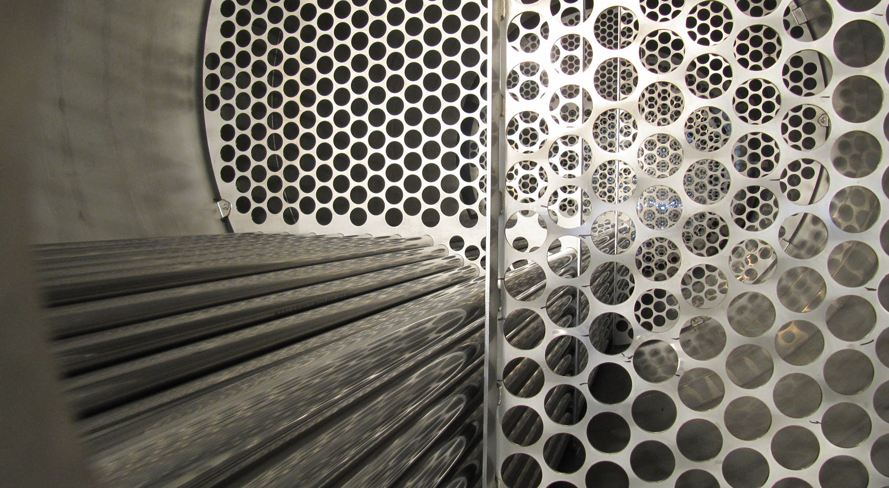 Falling Film Evaporators based on client-specific designs. Built completely in compliance with hygienic specifications (EHEDG). We build evaporators and heat exchangers in all sizes, from small to large. 1800 2-inch pipes with a length of 20 metres are no exception. We realise tube-tube plate joints by rolling the ends of the tubes and joining the parts with an orbital welding machine (no crevice corrosion). Completely finished and – if so desired – insulated.